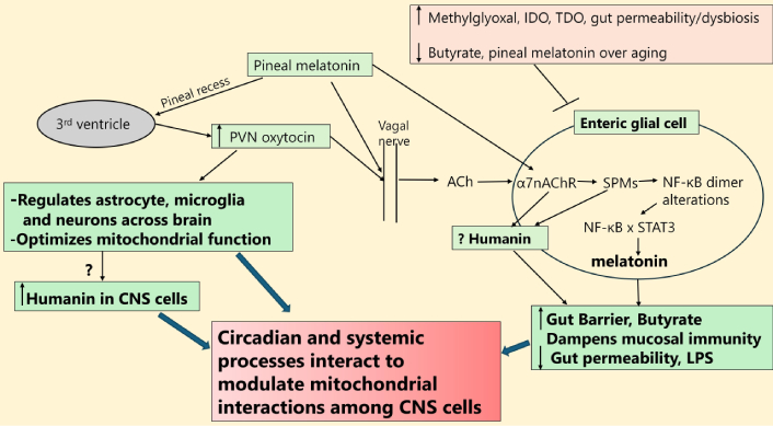 The short-chain fatty acid, butyrate, produced under more optimal gut conditions is a powerful pan-histone deacetylase inhibitor (HDACi), which optimizes mitochondrial function, increases mitochondrial sirtuin-3 [114], upregulates the mitochondrial melatonergic pathway (as shown in intestinal epithelial cells [115]) and can be used as a preferential (vs. acetate) metabolic substrate for astrocytes [116]. Melatonin, including via the oxytocin/vagal/α7nAChR pathway, can modulate core CNS processes via impacts on the gut microbiome, as well as decreasing gut permeability to prevent lipopolysaccharide (LPS) from entering the circulation [117]. Pineal melatonin and the oxytocin/vagal/α7nAChR pathway are proposed to mediate their effects on gut enteric glial cells, which are powerful determinants of coordinated changes in cells around the gut, including the mucosal immune system, intestinal epithelial cells, and enteroendocrine cells as well as the enteric nervous system [118]. Enteric glial cells have a number of astrocytic features, and whether enteric glial cells are a significant source of gut humanin will be interesting to determine. Overall, such data highlights how circadian and systemic processes may interact to modulate core processes in key CNS cells. See Figure 4.