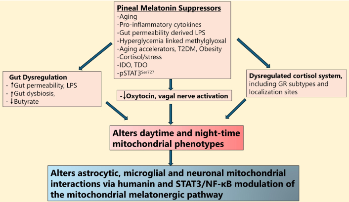 Pineal melatonin regulates mitochondrial phenotypes to determine glial-neuronal interactions. Shows how pineal melatonin suppressors, especially aging, impact the gut, oxytocin, vagal, and cortisol system to modulate diurnal mitochondrial phenotypes to alter glial-neuronal interactions. LPS: lipopolysaccharide; T2DM: type 2 diabetes mellitus; IDO: indoleamine 2,3-dioxygenase; TDO: tryptophan 2,3-dioxygenase; pSTAT3Ser727: phosphorylated signal transducer and activator of transcription 3 at Serine727; GR: glucocorticoid receptor; NF-κB: nuclear factor kappa-light-chain-enhancer of activated B cells.