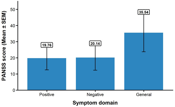 PANSS symptom scores in schizophrenia participants (n = 120). Bars represent mean scores for Positive, Negative, and General symptom domains. Error bars indicate standard error of the mean (SEM). PANSS: Positive and Negative Syndrome Scale.