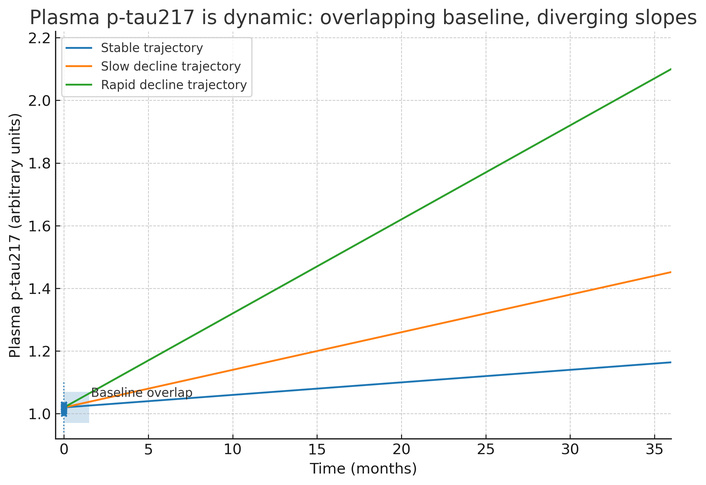 Diverging plasma p-tau217 slopes across progression clusters (stable/slow/rapid decline), based on data in the Kirsebom et al. (2025) report [10]. While baselines overlap, slopes diverge, showing that repeated measures enable effective monitoring, whereas a single cut-off is inadequate for patient stratification. p-tau217: tau phosphorylated at threonine 217.