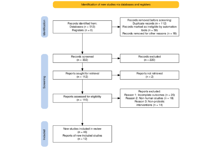 Literature search and study selection [Preferred Reporting Items for Systematic reviews and Meta-Analyses (PRISMA) flow]: A comprehensive literature search was performed across five electronic databases, PubMed, Google Scholar, Scopus, Web of Science, and Cochrane Library, covering publications from January 2000 to July 2025. The search initially retrieved 512 records, of which 112 duplicates were removed. An additional 50 records were automatically excluded based on pre-defined filters for publication date, language (English), and title relevance. Further exclusions for editorials, conference abstracts, and animal-only studies (n = 18) resulted in 332 records screened at the title and abstract level, with 220 excluded for irrelevance. Full texts of 112 reports were sought, with 2 not retrieved, leaving 110 full texts assessed for eligibility. Ultimately, 58 studies were included in the final synthesis, comprising 46 for qualitative analysis and 12 randomized controlled trials (RCTs) for quantitative/meta-analytic synthesis. The PRISMA flowchart (Figure 1) summarizes the study selection process and ensures transparency and reproducibility.