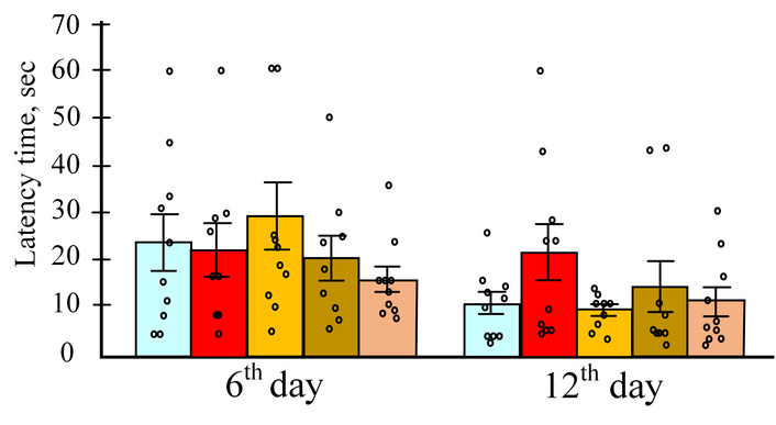 Statistical analysis was carried out using the Statistica 12 software package (StatSoft, USA). Results are presented as means ± SEM. The normality of the data distribution was assessed using the Shapiro-Wilk test. Since the data distribution differed from normal, we used non-parametric statistical methods. The statistical significance of differences between groups was assessed by the Kruskal-Wallis test. Statistical significance was considered to be p < 0.05.