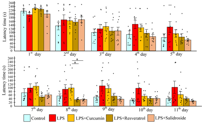 Learning performance during acquisition training and reversal training. Time in acquisition (upper row), reverse learning (lower row). The results are expressed as means ± SEM. Control, n = 10; LPS, n = 9; LPS + curcumin, n = 10; LPS + resveratrol, n = 9; LPS + salidroside, n = 10. *p < 0.05-comparison of the control group and experimental groups using the Kruskal-Wallis test. LPS: lipopolysaccharide.
