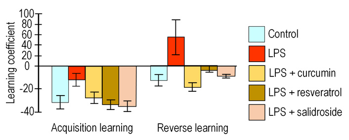 All experimental groups demonstrated improved performance during acquisition training, as indicated by negative learning coefficients ranging from –13.6 (LPS group) to –35.2 (LPS + salidroside group), though intergroup differences were non-significant. While resveratrol treatment showed a trend toward enhanced learning (lower coefficient vs. LPS group; p = 0.07), this did not reach statistical significance. During reversal training, only the LPS group exhibited a positive learning coefficient (53.3 ± 33.7), reflecting impaired relearning capacity. In contrast, all polyphenol-treated groups maintained negative coefficients, with the curcumin group showing the lowest value (–17.3 ± 3.5), approximately 4-fold lower than LPS controls, though this difference trended toward but did not reach significance (p = 0.056) (Figure 3).