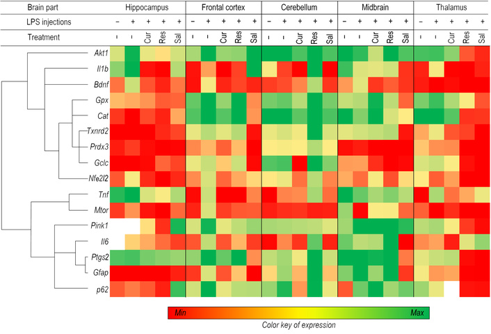 A heat map representing genes based on expression values in different parts of the brain is divided into two main clusters. Control, n = 10; LPS, n = 9; LPS + curcumin, n = 10; LPS + resveratrol, n = 9; LPS + salidroside, n = 10. LPS: lipopolysaccharide.