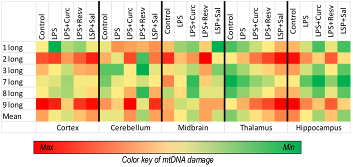 A heat map showing the amount of mtDNA damage in different parts of the brain. Control, n = 10; LPS, n = 9; LPS + curcumin, n = 10; LPS + resveratrol, n = 9; LPS + salidroside, n = 10. mtDNA: mitochondrial DNA; LPS: lipopolysaccharide.