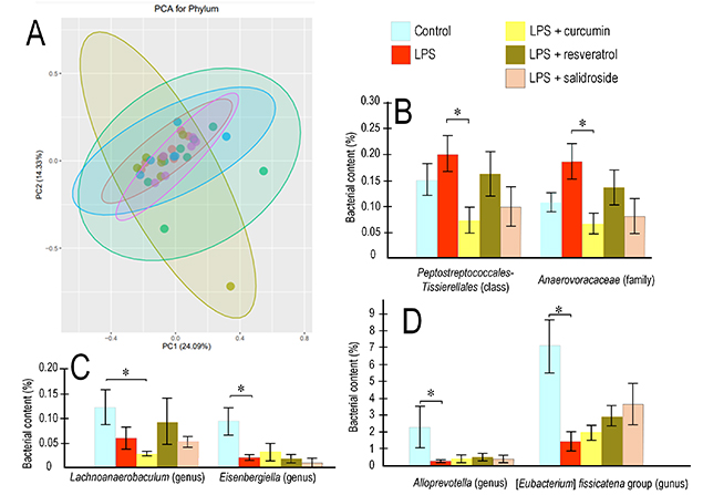 Bacterial composition of the gut microbiome. PCA graph for the microbiome of mice that received polyphenols against the background of induced inflammatory processes (A). Changes in the level of bacteria of the Peptostreptococcales-Tissierellales class and the Anaaerovoraceae family (B); genera Lachnoanaerobaculum and Eisenbergiell (C); as well as Alloprevotella and [Eubacterium] fissicatena group (D). Control, n = 10; LPS, n = 9; LPS + curcumin, n = 10; LPS + resveratrol, n = 9; LPS + salidroside, n = 10. Reliability of differences between groups: *p < 0.05 (Kruskal-Wallis criterion). LPS: lipopolysaccharide; PCA: principal component analysis.