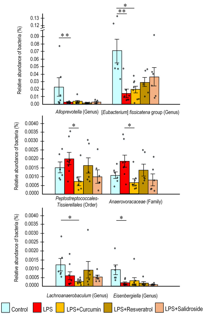 The content of the predominant bacteria in the gut microbiome. The results are expressed as means ± SEM. Control, n = 10; LPS, n = 9; LPS + curcumin, n = 10; LPS + resveratrol, n = 9; LPS + salidroside, n = 10. *p < 0.05, **p < 0.01 comparison of the control group and experimental groups using the Kruskal-Wallis test. LPS: lipopolysaccharide.