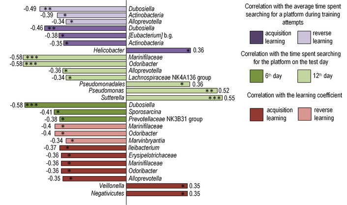 Among the main data that we obtained during the Morris water maze, we examined the average values of the time that mice spent searching for a platform during five training days during acquisition and reverse training. Bacteria of the genus Dubosiella (rs = –0.49, p < 0.01 for reverse learning and rs = –0.46, p < 0.01 for acquisition learning) and the class Actinobacteria (rs = –0.39, p < 0.05 for reverse learning and rs = –0.35, p < 0.05 for acquisition learning) correlated negatively with these parameters. [Eubacterium] brachy group was negatively correlated with the total average time during acquisition training (rs = –0.38, p < 0.05), and a positive correlation was observed with the pathogenic genus Helicobacter (rs = 0.36, p < 0.05). The total training time during the reverse learning is negatively correlated with Alloprevotella (rs = –0.34, p < 0.05) (Figure 8).