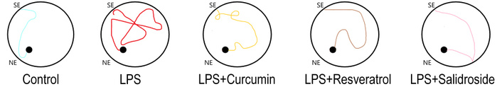 The time that the mice spent on the control days of the test. The results are expressed as means ± SEM. Control, n = 10; LPS, n = 9; LPS + curcumin, n = 10; LPS + resveratrol, n = 9; LPS + salidroside, n = 10. LPS: lipopolysaccharide.