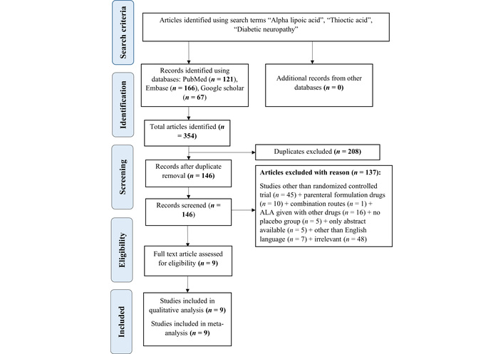PRISMA flow chart. From 354 initially identified articles (PubMed: 121, Embase: 166, Google Scholar: 67), 208 duplicates were removed. After screening, 137 articles were excluded, resulting in 9 randomized controlled trials. Source: https://www.prisma-statement.org/. This work is licensed under CC BY. PRISMA: Preferred Reporting Items for Systematic Reviews and Meta-Analyses; ALA: alpha lipoic acid.