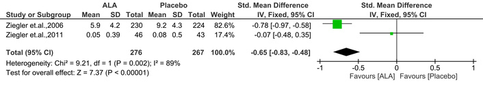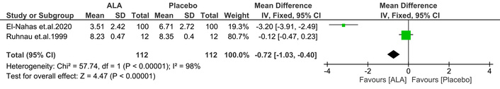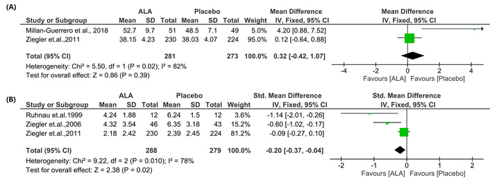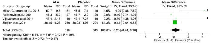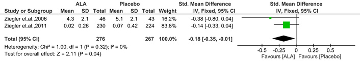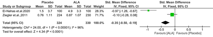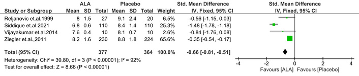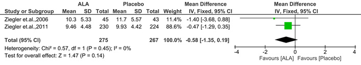 The TSS questionnaire asks patients to rate the intensity (absent, mild, moderate, severe) and frequency (occasional, often, continuous) of four symptoms: pain, burning, paresthesia, and numbness. The score ranges from 0, indicating no symptoms, to 14.64, signifying severe and nearly constant presence of all four symptoms [38]. This MA exposed that ALA has a beneficial role in improving the TSS when compared to placebo/control.