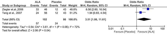 Effect of ALA on Global satisfaction ratings. ALA treatment significantly increased the proportion of participants rating their experience as “good/very good” compared to placebo (M-H: 3.51; 95% CI: 1.06 to 11.61; p = 0.04; I2 = 72%), reflecting enhanced perceived therapeutic benefit. ALA: alpha lipoic acid; M-H: Mantel-Haenszel; CI: confidence interval.