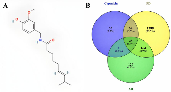 Chemical structure of capsaicin in 2D with PubChem CID: 1548943 (A); and a Venn diagram illustrating the matched targets between capsaicin and targets associated with PD and AD (B). AD: Alzheimer’s disease; PD: Parkinson’s disease.