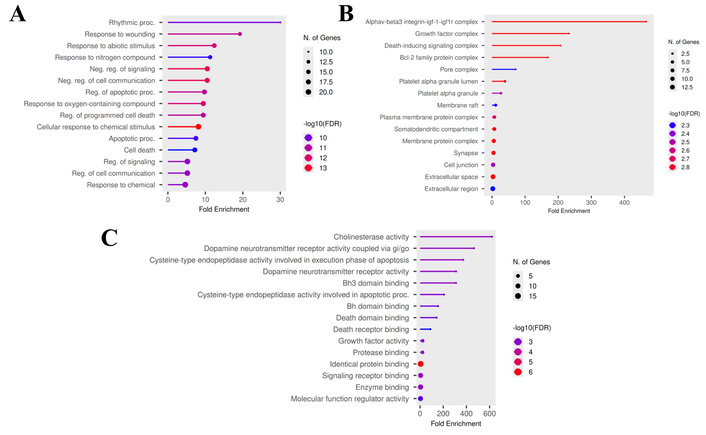 GO and pathway enrichment analyses for the 25 significant genes [VEGFA, BCL2 (apoptosis regulator Bcl-2), HMOX1, ABCB1, BAX, CASP3 (caspase 3), CASP7, FAS, GSK3B (glycogen synthase kinase-3 beta), IGF1 (insulin-like growth factor 1), IGF1R (IGF1 receptor), IL6 (interleukin-6), KNG1, NGF, NOS3 (nitric oxide synthase 3), SIRT1, CNR2, BCHE, ACHE, DRD2, DYRK1A, VCP, DRD3, ESR1, SLC6A4] were conducted using ShinyGO 0.85. The study showed that CAP is primarily involved in BP related to the rhythmic process and the response to wounding (Figure 2A). Conversely, the cellular components ontology primarily encompasses genes encoding proteins found in the IGF1R and growth factor complexes (Figure 2B). Regarding the MF ontology, the genes were associated with cholinesterase and dopamine neurotransmitter receptor activities (Figure 2C).