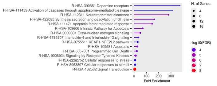 The results of the Reactome pathway enrichment analysis (Figure 3) indicated that the principal targets have a significant effect on dopamine receptors and on caspase activation via the apoptosome.