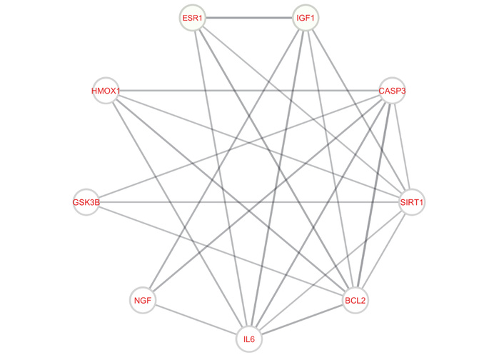 The STRING database for the Retrieval of Interacting Genes/Proteins was utilized to construct the protein-protein interaction network, which was subsequently introduced and visualized in Cytoscape (Figure 4). In this network, nodes represent target proteins, and edges indicate interactions between them. Furthermore, through topological network analysis, the hub genes BCL2, SIRT1, CASP3, IL6, HMOX1, ESR1, IGF1, NGF, and GSK3B were determined. However, IGF1R and NOS3 were not present in all three groups (Table 1); therefore, they were excluded from subsequent evaluations.