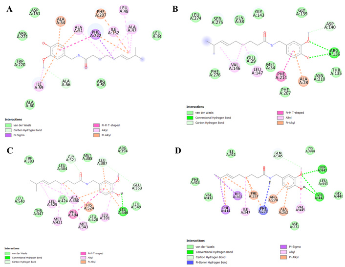 Finally, the four combinations with the lowest docking values were chosen to elucidate the various bond types between the proteins and the active compound (Figure 5).