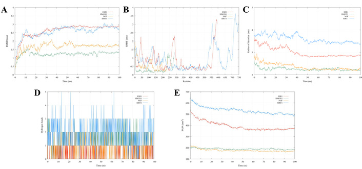 Molecular dynamics analysis for ESR1, HMOX1, NGF, and SIRT1. (A) Root-mean-square deviation (RMSD); (B) root-mean-square fluctuation (RMSF); (C) radius of gyration; (D) hydrogen bonds; (E) solvent-accessible surface area (SASA). ESR1: estrogen receptor 1; HMOX1: heme oxygenase 1; NGF: nerve growth factor; SIRT1: sirtuin 1.