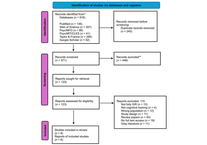 Results: Out of the 816 records identified, 123 full texts were screened, and eight studies were included in the review. The included studies all involved participants completing a cognitive training intervention using fully IVR headsets, with cognitive outcomes measured before and after the intervention. The most consistent improvements across the included studies were executive function, memory, and visuospatial abilities. Only two studies explicitly referenced a theoretical model.
