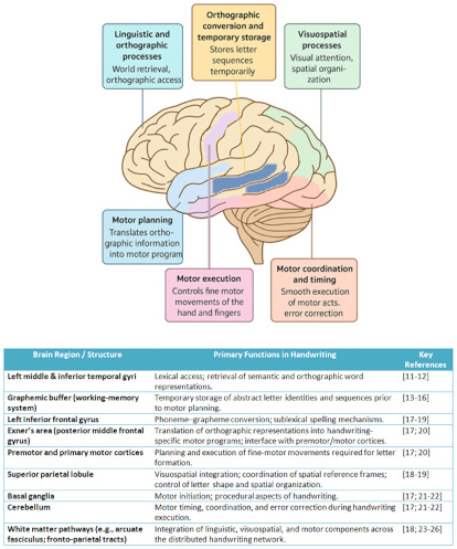Writing is a complex cognitive-motor activity that integrates linguistic, visuospatial, executive, and fine-motor processes [15–17]. Its successful execution relies on the coordinated function of a distributed neural network extending across frontal, parietal, temporal, and subcortical regions (Figure 1).
