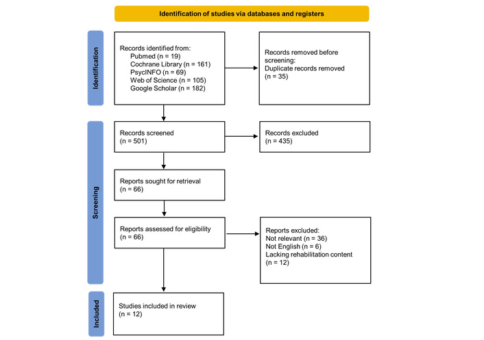 A total of 536 articles were identified through the main search strategy, while no additional studies were identified through forward or backward citation tracking. After removing 35 duplicates, 501 studies were screened based on titles and abstracts. Of these, 435 were excluded, leaving 66 articles for full-text review. Fifty-four articles were not included for various reasons (e.g., not relevant, lacking rehabilitation content, published in languages other than English, etc.). Following the inclusion/exclusion process, the present SR includes 2 RCTs [48, 49] and 10 non-RCTs [13, 50–58]. The main characteristics of the included studies are reported in Table 2, and the entire inclusion/exclusion process is summarized in the PRISMA flow chart (Figure 2).