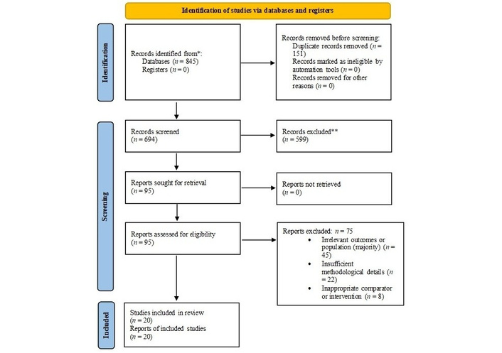 The quality of eligible studies was assessed using established tools. Systematic reviews were evaluated according to the Preferred Reporting Items for Systematic Reviews and Meta-Analyses (PRISMA) 2020 guideline [30]. The initial search identified 845 records from PubMed, Scopus, and the Cochrane Library. After removing 151 duplicates, 694 unique articles remained. Screening of titles and abstracts resulted in 95 studies selected for full-text review. Of these, 75 were excluded due to irrelevant outcomes, inappropriate study populations, or inadequate methodological quality. Ultimately, 20 studies fulfilled the inclusion criteria and were incorporated into the systematic review, comprising 11 RCTs and related primary analyses, five systematic reviews or meta-analyses, and four narrative, cohort, or modeling studies.
