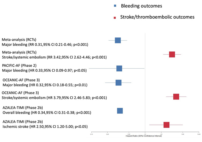 Evidence from RCTs indicates that FXI inhibitors substantially reduce the risk of major bleeding compared with DOACs. However, this safety benefit is accompanied by an increased risk of stroke or systemic embolism. A recent meta-analysis reported a significantly lower risk of major bleeding with FXI inhibitors (RR 0.31; 95% CI 0.21–0.46), together with a higher incidence of thromboembolic events (RR 3.17; 95% CI 2.18–4.62) compared with DOACs in patients with AF [33].