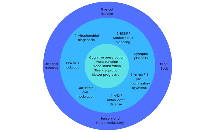 Importantly, these non-pharmacological strategies are not confined to symptom management but may exert genuine neuroprotective and neurorestorative effects by enhancing neuroplasticity, preserving synaptic integrity, and promoting adaptive immune and metabolic responses. Advances in neuroimaging, molecular biology, and biomarker research have strengthened the biological plausibility of these effects, revealing measurable changes in brain structure, connectivity, and inflammatory and oxidative profiles following integrative interventions [9]. At the same time, translational challenges remain, including heterogeneity in intervention protocols, variability in outcome measures, and limited standardization across clinical studies.