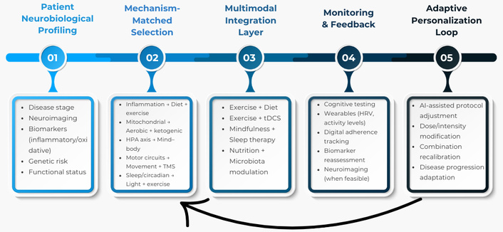To operationalize the integration of non-pharmacological strategies within clinical practice, a translational precision framework is proposed (Figure 2). This pipeline model emphasizes patient stratification based on clinical phenotype, disease stage, neuroimaging findings, and molecular biomarkers, followed by mechanism-matched selection of targeted interventions. Rather than applying uniform lifestyle recommendations, this approach aligns specific therapies—such as exercise, dietary modulation, mind–body practices, or neuromodulatory techniques—with dominant pathophysiological drivers, including neuroinflammation, mitochondrial dysfunction, or HPA axis dysregulation. The model further incorporates multimodal integration, objective monitoring through functional and biological markers, and adaptive personalization using digital tools and iterative feedback. By structuring integrative neuroprotection within a closed-loop, precision-based system, this framework bridges mechanistic insights and clinical implementation, advancing the field toward individualized, biomarker-informed therapeutic strategies. Within the proposed precision pipeline (Figure 2), the vitactions perspective may operate primarily at the levels of intervention selection and adaptive personalization, ensuring that mechanistically matched therapies are also intrinsically meaningful and behaviorally sustainable.
