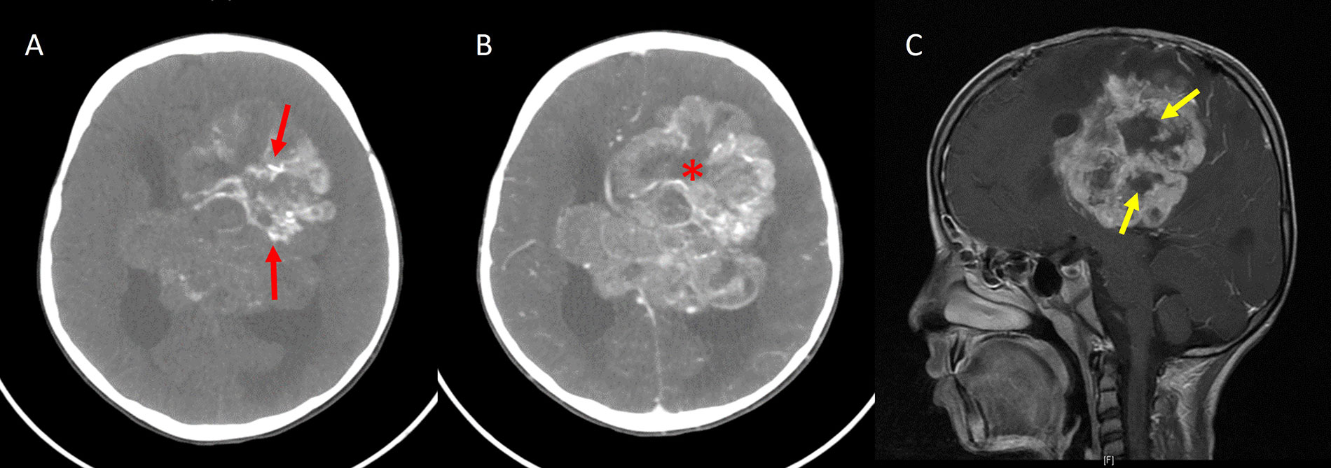 Periwinkle sign. A. Axial noncontrast-enhanced CT image shows a large heterogeneous mass in the periventricular location of the left frontoparietal lobe with centripetal calcification (red arrows); B. axial contrast-enhanced CT image showing heterogeneous enhancement of the lesion with the central necrotic area (asterisk), resembling the shape of a flower; C. sagittal contrast-enhanced T1W image of the same patient also shows a central non-enhancing area of necrosis in the shape of a flower (yellow arrows)