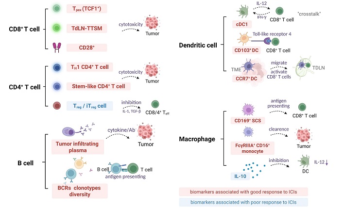 Although the direct correlation between macrophages and ICIs therapy in TDLNs has yet to be thoroughly investigated, available studies suggest that macrophages in TDLNs have the potential to serve as predictive markers of response to ICIs therapy. This dual role of macrophages underscores the need to precisely modulate macrophage function to maximize its role in promoting anti-tumor immune responses when developing new immunotherapeutic strategies. Figure 3 summarizes the immune cell characteristics within TDLNs as predictive features for the response to ICIs.