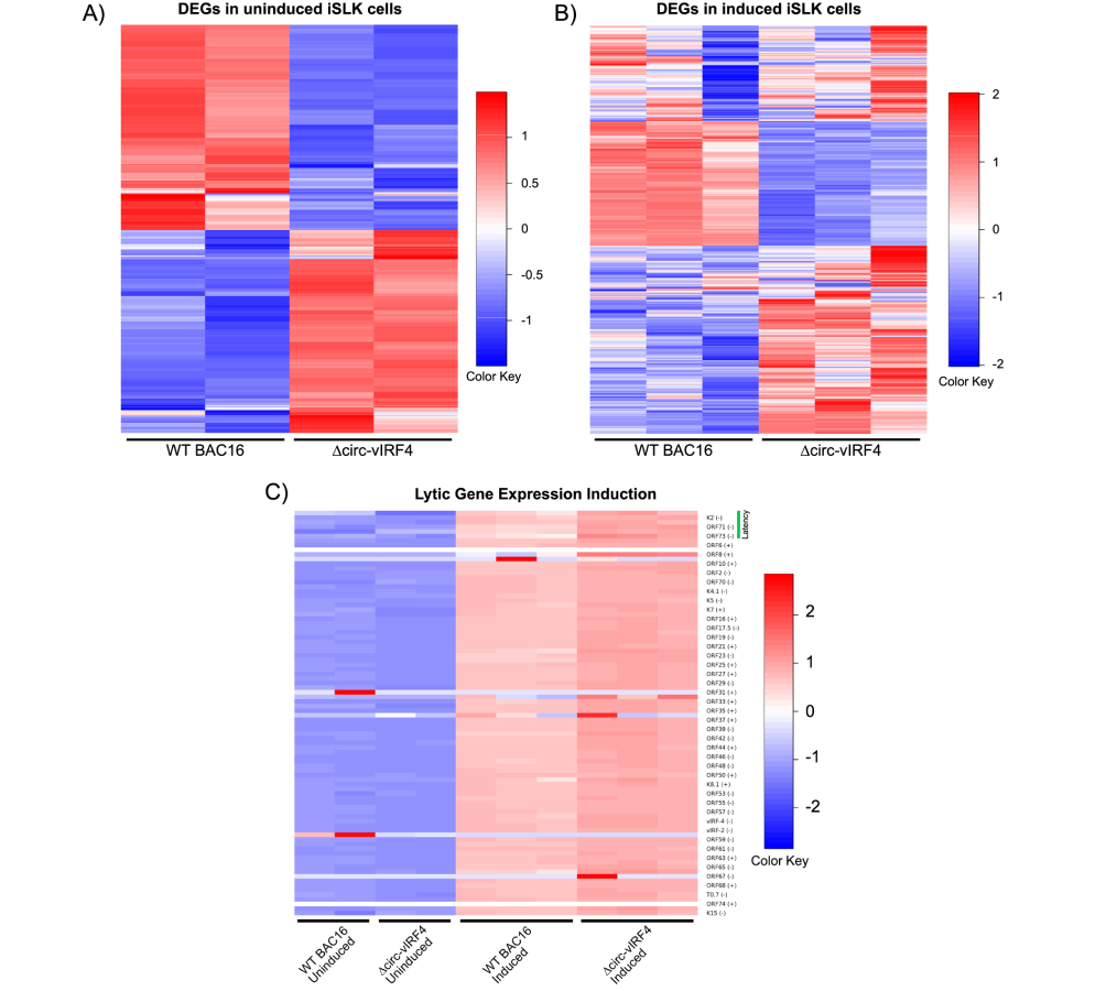 Gene expression analysis of ∆circ-vIRF4 in iSLK cells. (A) Heat maps of differentially expressed genes for uninduced datasets; (B) heat maps of differentially expressed genes for induced datasets; (C) heat map of lytic gene expression induction. Blue indicates downregulation and red indicates upregulation. vIRF4: viral interferon regulatory factor 4