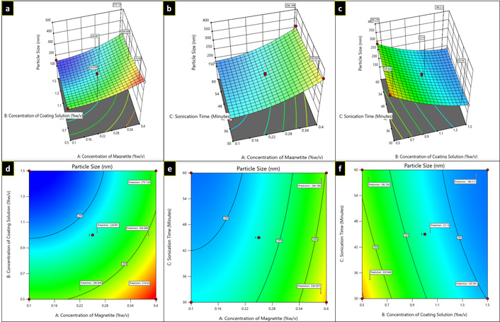 Three-dimensional plots (a–c) and contour plots (d–f) showing the effect of independent variables on particle size.