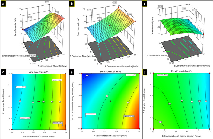 Three-dimensional plots (a–c) and contour plots (d–f) showing the effect of independent variables on zeta potential.