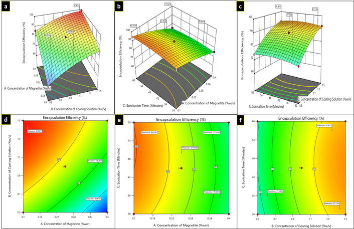 Three-dimensional plots (a–c) and contour plots (d–f) showing the effect of independent variables on encapsulation efficiency.