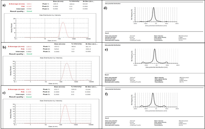 Particle size (a–c) and Zeta potential (d–f) of bare MNPs, MNPs with coating, and CUR-PIP-F68-Fe3O4 NPs, respectively. MNPs: magnetic nanoparticles.