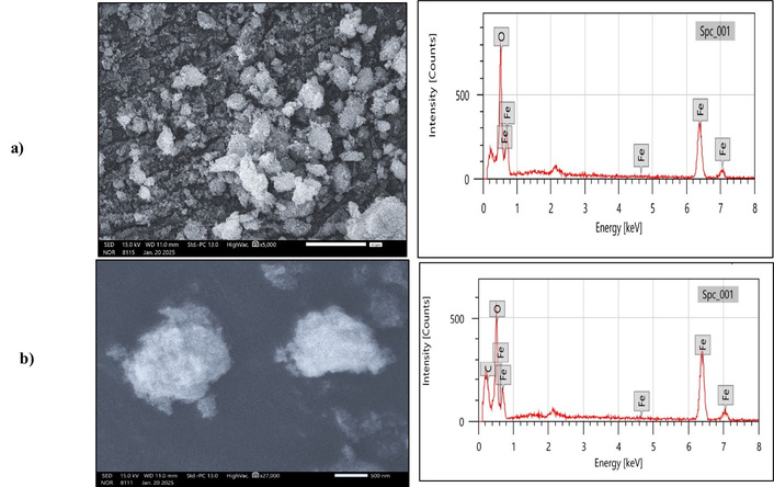 SEM-EDX analysis of the synthesized bare MNPs and drug-loaded iron oxide nanoparticles was conducted using an SEM (JSM 6100, Jeol) to investigate their morphology and elemental composition. For this analysis, a small amount of the nanoparticle sample was dispersed onto a conductive substrate, and a gold coating was performed to prevent charging under the electron beam [28].