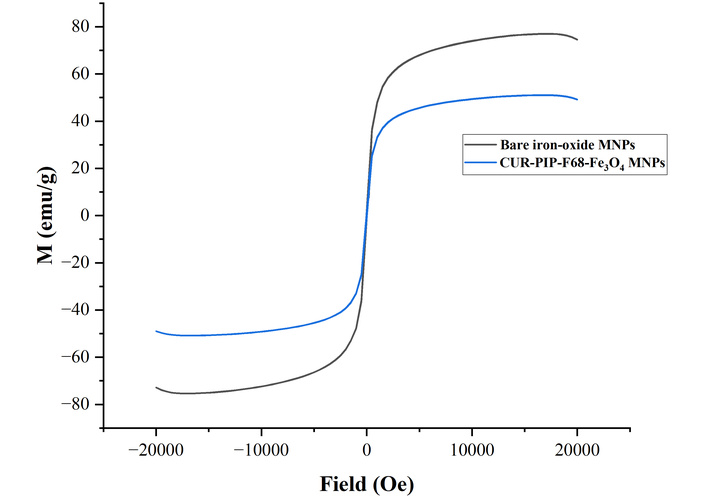 The magnetic characteristics of bare MNPs and CUR-PIP-F68-Fe3O4 nanoparticles were determined by measuring magnetization as a function of field. Figure 8 shows the acquired data [saturation magnetization (Ms)]. The saturated magnetization of CUR-PIP-F68-Fe3O4 nanoparticles was found to be 50.7 emu/g, compared to bare MNPs (Fe3O4 nanoparticles), which possess the Ms of 75.6 emu/g.
