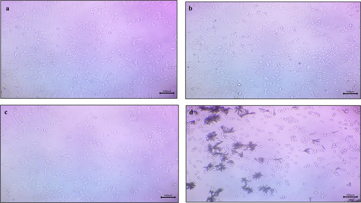 Microscopy images of a) free curcumin and piperine drug, b) curcumin MNPs, c) piperine MNPs, and d) CUR-PIP-F68-Fe3O4 NPs (scale: 100×).