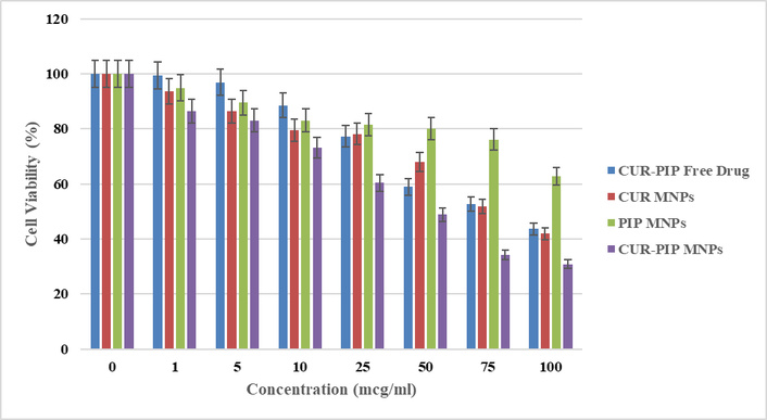 IC50 values were estimated and were found to be 87.47 ± 0.28, 79.68 ± 0.41, 115.84 ± 0.25, and 50.24 ± 0.57 mcg/mL for free curcumin and piperine drug, Curcumin MNPs, Piperine MNPs, and a combination of curcumin and piperine MNPs, respectively, based on the 24-hour cell viability data (Figure 10). The results demonstrate that MNPs encapsulated with CUR-PIP have a greater cytotoxicity impact than individual curcumin. As demonstrated in multiple papers [55, 56], this suggests that the nanoprecipitation method can increase the bioavailability of CUR and/or PIP in cancer cells, hence intensifying its lethal action. These findings are consistent with those of Abolhassani et al. [57] about the self-assembly approach used to generate CUR-PIP-loaded human serum albumin (HSA) nanoparticles. Their results show that CUR-PIP-HSA nanoparticles are highly cytotoxic, which may be explained by Piperine dual functions as a bio-enhancer and anti-cancer agent. Compared to CUR-HSA nanoparticles, CUR-PIP-HSA nanoparticles exhibited noticeably greater cell inhibition rates. Compared to PIP-HSA nanoparticles, CUR-PIP-HSA nanoparticles had a higher cytotoxic effect on MCF-7 cells.