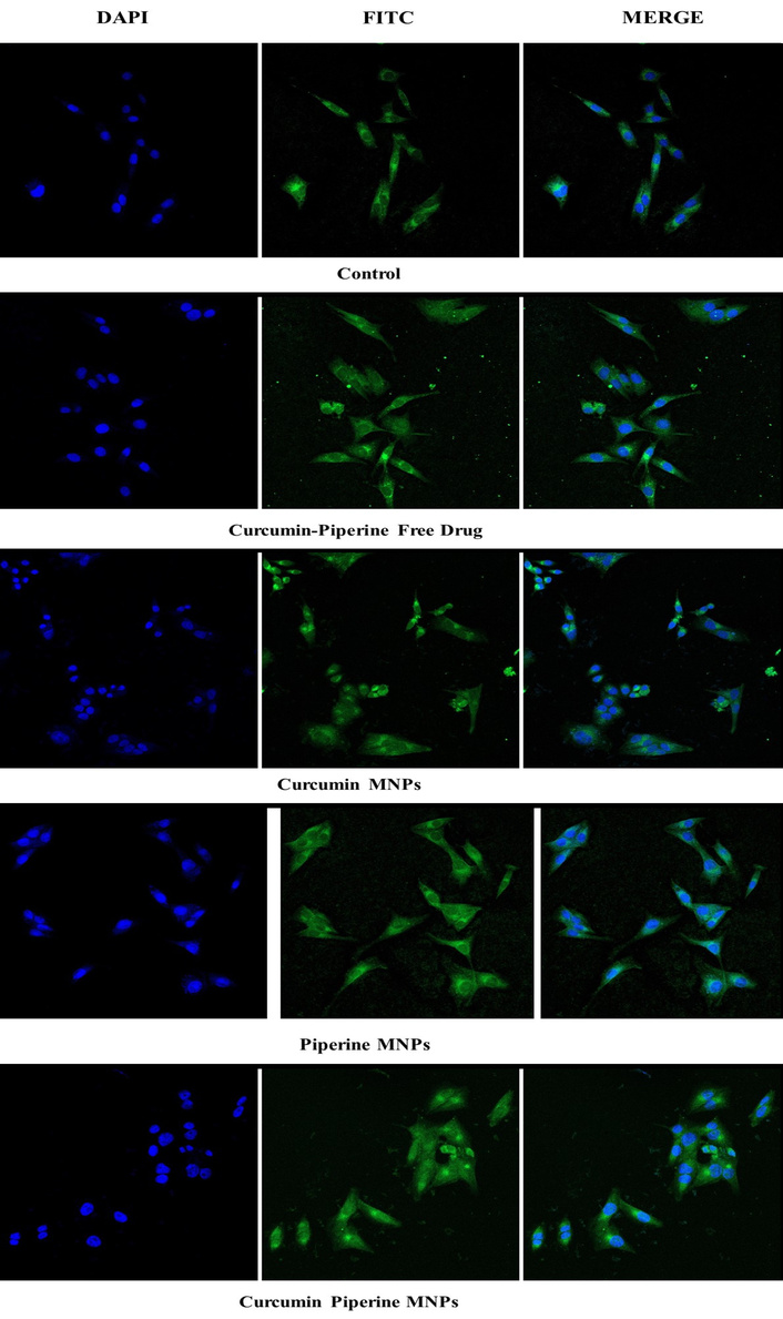 Ultraclean coverslips were placed in 6-well plates, followed by the addition of 200 µL 3-aminopropyltriethoxysilane (APTES) (APTES is a silane coupling agent that is commonly used to modify the surface of sample Particles to improve their cellular uptake) to each well, ensuring that each coverslip was dipped properly. After 1 h of incubation, the APTES solution was collected back into the stock solution. The well was rinsed with complete medium twice to remove any traces of APTES. At 90% confluency, cells were harvested from the flask. Then, cells were seeded in 6-well plates at a density of 5,000 to 10,000 cells/well in appropriate medium. The plate was incubated for 24 h at 37°C with 5% CO2. Next, the medium was removed, and fresh culture media were added to the well of the plate containing desired concentrations of compound/ formulation and 1 µL per mL of fluorescein isothiocyanate (FITC), and incubated for 24 h. FITC was covalently conjugated to the nanoparticles by reacting with the isothiocyanate group of FITC with the primary amines present on the surface of the nanoparticles. The amine groups were loaded by a surface functionalization with APTES. Reaction was performed in the dark with mild stirring at room temperature for 12–24 h. The nanoparticles labeled with FITC were purified by extensive washing to elute unbound dye from their surface. This covalent coupling results in a stable thiourea bond and ensures predictable fluorescence labeling. After the incubation period, the culture medium was removed, and 1 mL of 3% paraformaldehyde solution was added and incubated for 20 min. Then the plate was rinsed with sterile PBS. 100 µL of 1 µg/mL DAPI (4’,6-diamidino-2-phenylindole) solution was added to the coverslip and incubated for 30 min, and then rinsed with sterile PBS. At last, the coverslip was taken off and placed on a spotless slide [32]. An Inverted Laser Scanning Confocal Microscope (LSM 900, ZEISS) was used to examine the prepared slides. The cellular internalization of CUR-PIP-loaded MNPs was measured through the intrinsic autofluorescence properties of curcumin (green fluorescence; excitation/emission ~420/530 nm). Three groups of images—DAPI, FITC, and Merged—were captured. The software ImageJ (Version 1.54d) was then used to analyze the images and assess their intensity.