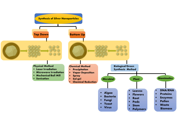 AgNPs are synthesized through various techniques, including chemical, photochemical, electrochemical, and green methods. Among them, chemical reduction using agents like sodium citrate and borohydride is common, though it poses toxicity concerns [22–24]. Green synthesis has emerged as a safer, eco-friendly alternative using plant extracts, microbes, and natural polymers [25]. Additionally, AgNPs are employed in bio and electrochemical sensors due to their excellent catalytic and electronic properties [26, 27]. While their antibacterial potential is well-documented, uncertainties remain regarding their toxicity and mechanisms at the cellular level [28]. These NPs can interfere with cellular proteins, nucleic acids, and membranes, causing microbial death, but their safety as an antibiotic substitute is still debated [29, 30].