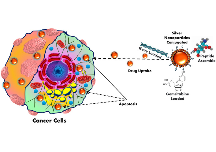 Figure 3 shows AgNPs functionalized with peptides, genes, or chemotherapeutic drugs like gemcitabine for targeted cancer therapy. Exploiting the EPR effect, AgNPs accumulate in tumor tissues and are internalized by cancer cells. This leads to efficient drug uptake and induction of apoptosis, enhancing anticancer efficacy.