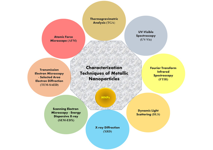 The NPs are characterized by using a variety of techniques to determine factors like size distribution, particle size, shape, and surface area. These are especially important if homogeneous NPs characterization is required for a specific application. Numerous common spectroscopy and microscopy methods are used to characterize NPs, including UV-visible spectroscopy (UV-Vis), X-ray diffraction (XRD), Fourier transform infrared spectroscopy (FTIR), dynamic light scattering (DLS), atomic force microscope (AFM), transmission electron microscopy (TEM), scanning electron microscopy (SEM), energy dispersive X-ray (EDX), and Raman spectroscopy, which are all common spectroscopy and microscopy techniques. These techniques, based on microscopy, are considered direct methods used for acquiring data from images of NPs, and are widely utilized to determine the size and morphological properties of NPs (see Figure 2) [125–127].
