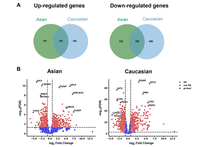 Aim: Hepatocellular carcinoma (HCC) displays both shared and ethnicity-specific molecular characteristics. Using transcriptomic data from The Cancer Genome Atlas (TCGA), we compared gene expression profiles between Asian and Caucasian HCC patients.