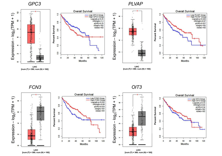 Using GEPIA2 (http://gepia2.cancer-pku.cn/), the expression levels of these genes were obtained (Figure 2). Based on the HPA, the 5-year survival of patients with high GPC3 expression was 46% against 60% in low-expressing patients, whereas patients with high PLVAP expression showed 54% versus 46% survival probability. Poorer prognosis was seen in patients with low FCN3 expression (37% vs. 55% in high-expressing patients) and with low OIT3 expression (42% vs. 63% in high-expressing patients).
