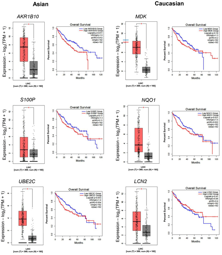 Differential gene expressions in the TCGA cohort and its association with overall survival. Boxplot comparing the expression levels of Asian-specific upregulated genes (AKR1B10, S100P, and UBE2C) and Caucasian-specific upregulated genes (MDK, NQO1, and LCN2). TPM: transcripts per million; LIHC: Liver Hepatocellular Carcinoma. Red box: tumor tissue, grey box: normal tissue. *: p < 0.05.