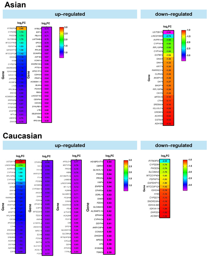 Differentially expressed genes between Asian and Caucasian HCC patients. Heatmaps displaying significantly upregulated and downregulated genes in Asian (top panel) and Caucasian (bottom panel) cohorts, based on RNA-seq data from the TCGA-LIHC dataset. The color scale represents the magnitude of log2FC. FC: fold change; HCC: hepatocellular carcinoma; TCGA: The Cancer Genome Atlas; LIHC: Liver Hepatocellular Carcinoma.