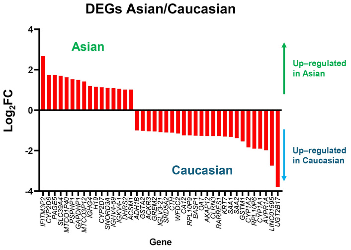 To further explore the difference between the two groups, gene expression profiles between Caucasian and Asian cancer samples were compared using each population alternately as a reference. This analysis revealed several genes that were differentially expressed depending on the direction of comparison.